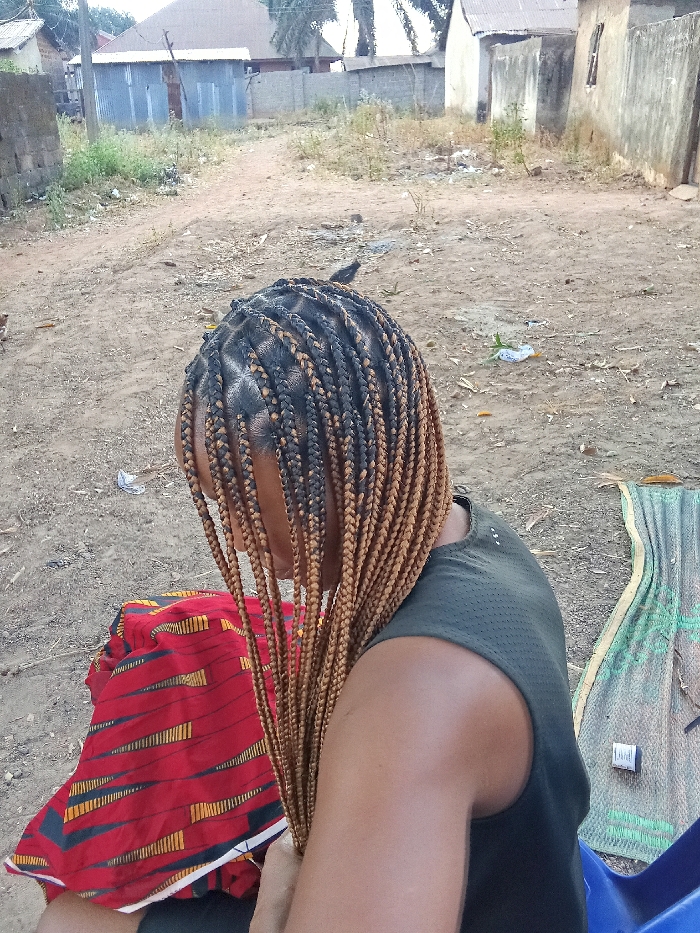 A woman with ombre box braids is sitting outdoors. Her braids transition from dark brown at the roots to blonde at the ends. She wears a dark green sleeveless shirt. A colorful patterned red cloth lies on her lap. In the background, there's a dirt road, several houses, and some greenery. A striped mat and a small white object rest on the ground to the right.
