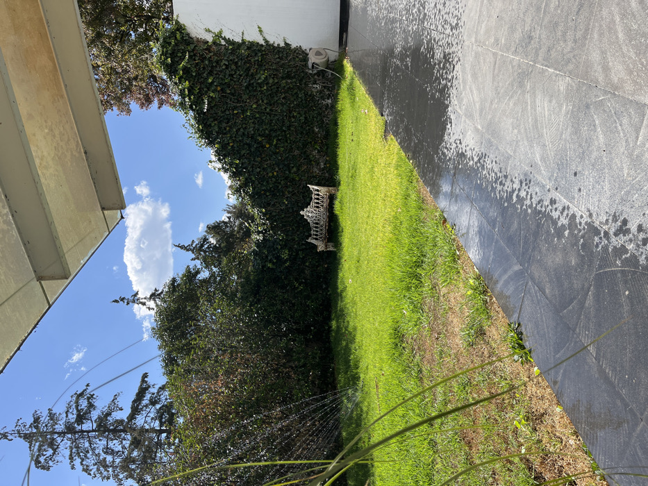 An outdoor scene features a green lawn extending from the bottom right to the upper left. A decorative white bench sits on the grass near a vine-covered wall. To the right of the lawn, a dark, tiled surface is visible. A sprinkler is in operation, with water droplets creating a hazy effect in the foreground. In the sky, there's a prominent white cloud against a blue backdrop. Trees surround the space, and a portion of a building's roof is visible in the upper left corner.