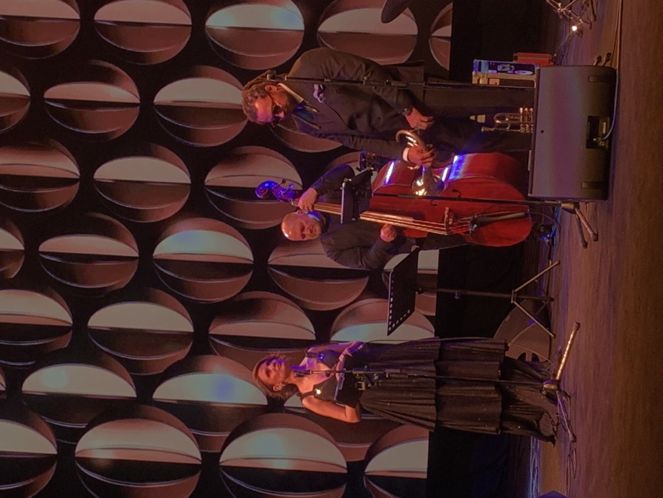 A dimly lit stage shows three musicians performing. A woman in a black dress stands, presumably singing, with a microphone in front of her. Above her, a bald man plays a large, reddish-brown stringed instrument. Higher still, a man with a beard plays a trumpet. A black speaker sits to the right of the stringed instrument player. The backdrop features a repeating pattern of dark circles with light-colored stripes, giving the impression of depth.