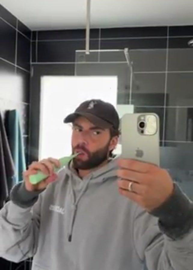 A man with a beard and a baseball cap is brushing his teeth in a bathroom. He is wearing a gray hoodie and holding a smartphone in his right hand to record himself in the mirror. The bathroom has black tiled walls and a glass shower door. A few towels hang on a rack to the left. The man moves the green toothbrush around his mouth, focusing on his upper and lower teeth.