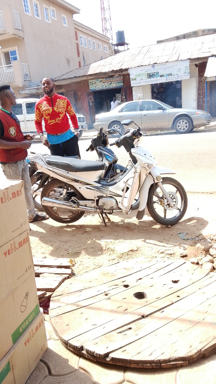 The image captures a sunlit street scene in Shaba, Nigeria. Two men stand in the mid-ground near two parked motorcycles. The man on the left wears a dark vest over a light shirt, light-colored jeans, and dark sandals, holding a small dark object in his hands. The man on the right wears a red long-sleeved shirt with gold patterns, black trousers, and blue undergarments visible at the waist; he has a beard and his hands are in his pockets. Both men appear to be looking at each other. A white and black "HERO" brand motorcycle with a chrome exhaust pipe is prominently parked on a kickstand in the mid-ground. Another motorcycle is partially visible behind it. In the background, a light-colored sedan, likely a Toyota Camry, is parked on a paved road. Further back, a white vehicle is partially obscured. The immediate foreground features stacked cardboard boxes labeled "VELL.MAX" and "LED BULB" on the left, next to a large, weathered wooden cable spool resting on grey interlocking paving stones. The background includes a multi-story beige residential building with white windows and balconies on the far left. To the right, a row of single-story commercial shops with corrugated metal roofs line the street. One shop displays a banner for "TOWARDS DMSMS," advertising electrical products, lighting, fittings, and accessories. Another shop front is partially visible, labeled "REQUED." A person in a white shirt is partially visible within one of the shops. A red and white lattice cell tower and a black water tank are visible against a clear sky in the upper background. The ground is a mix of dirt, sand, and paving.