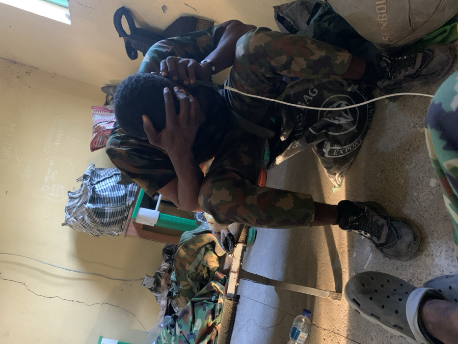 A soldier in camouflage uniform sits on the floor, head in hands. Luggage and bags surround him, one partially obscures him, while another bag behind him reads "EXPORT EAG". He appears distressed. A bottle of water sits near a metal frame on the floor. The wall behind him is yellowed and cracked. Numbers are written on the wall. Another person wearing camouflage with gray slip-on shoes is visible at the edge of the image on the right.