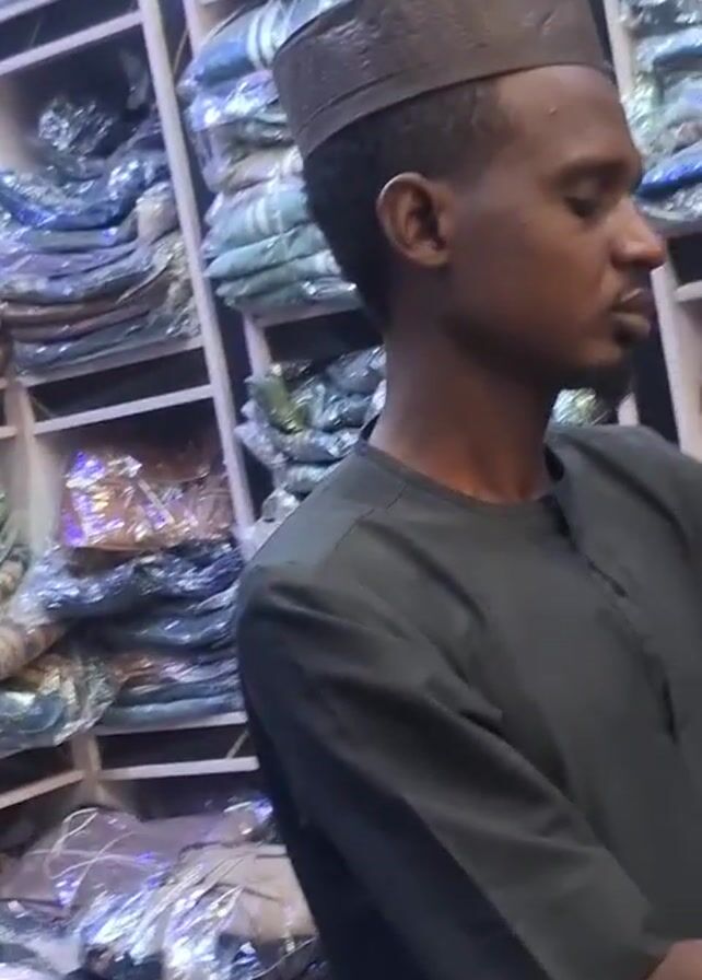 three separate men in a store, likely a clothing or textile shop. In the first shot, a man with a dark complexion wears a traditional brown cap and a dark green, collared, long-sleeved shirt, standing in front of shelves stocked with items in clear plastic packaging. In the next shot, the camera briefly focuses on a blue garment hanging on the shelves. The second man is wearing a blue top and a gray cap. He is also standing in front of the shelves with items in plastic packaging. Finally, the last man is wearing a tan shirt with a patterned collar. The background remains consistent with shelves filled with packaged goods.