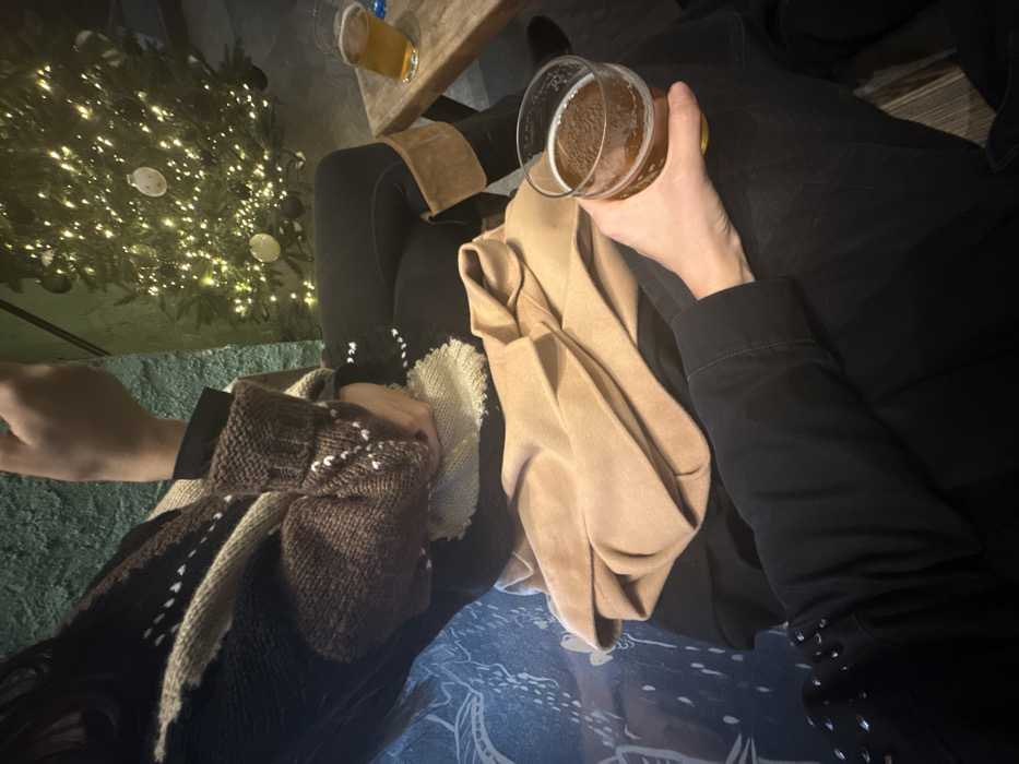 The scene is an indoor establishment in Palilula Urban Municipality, Serbia, observed from an elevated perspective. Two individuals are partially visible in a dimly lit environment. The upper individual (Person 1) is clad in a multi-patterned knit sweater featuring black, brown, and cream/beige sections with white speckling on the brown areas. They wear black leggings and dark boots with a tan cuff. Their left arm is bent and resting. The lower individual (Person 2) is dressed in dark clothing, including a black jacket or coat and black trousers. Person 2's right hand holds a glass containing an amber liquid, consistent with beer. A folded tan-colored garment rests on Person 2's lap. The individuals are seated in close proximity. To the right, a rustic wooden table holds a second glass of the same amber liquid. In the background, a Christmas tree adorned with numerous warm white lights and several white and black spherical ornaments is visible. The wall behind Person 1 displays a textured green/teal surface, while a dark wall on the far left features a lighter, intricate pattern.