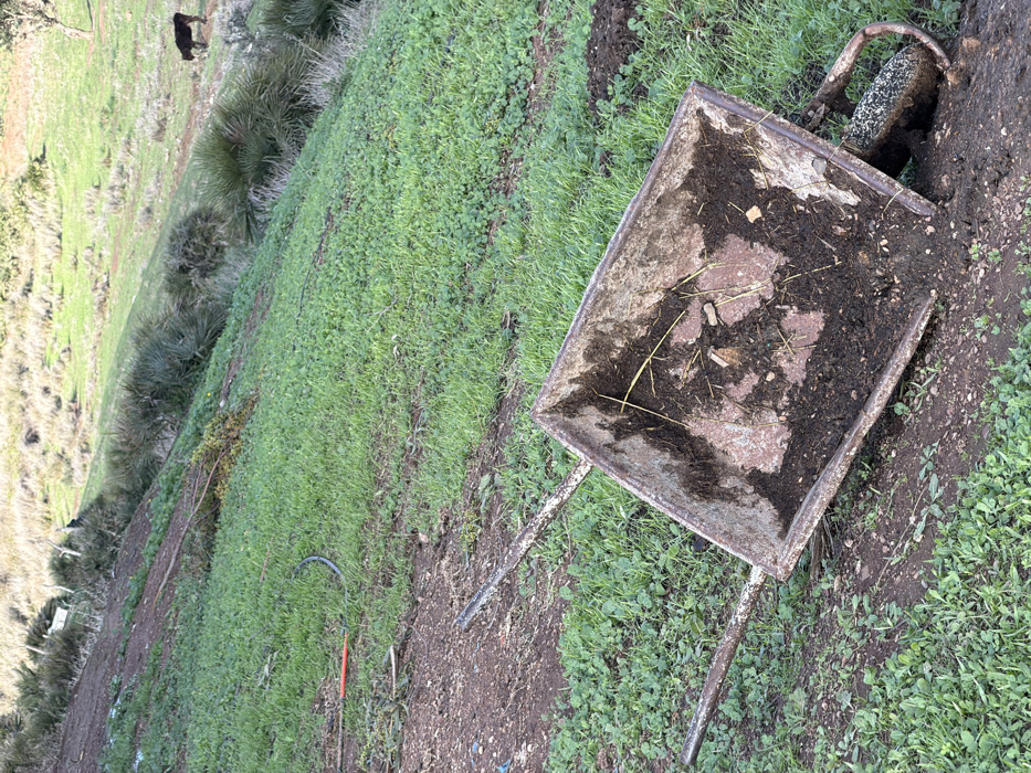 An overturned wheelbarrow sits on a grassy hill, its metal frame weathered and stained with dirt. Dark soil fills the interior, mixed with scattered debris. Patches of grass surround the wheelbarrow, leading down a gentle slope. In the background, a few sparse bushes and a dark object rest on the hillside.
