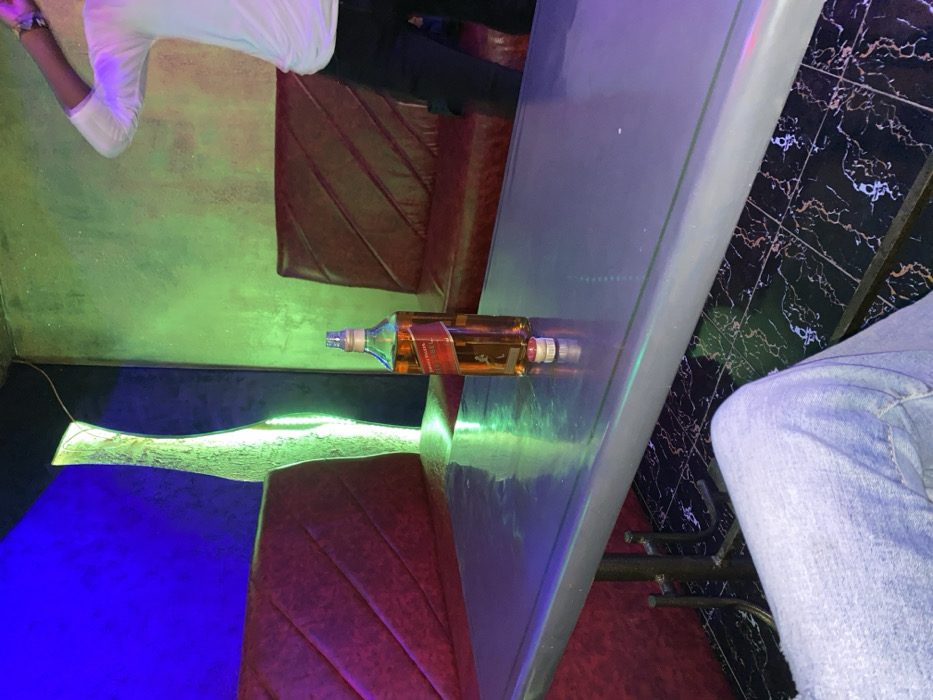 A bottle of Johnnie Walker Red Label lies horizontally on a bar top. One person sits at the bar, wearing blue jeans, while another stands nearby. The bar area features red patterned seating, a blue-lit section, and a wall decorated with black and white marble-like tiles. Green lighting casts an ambient glow.