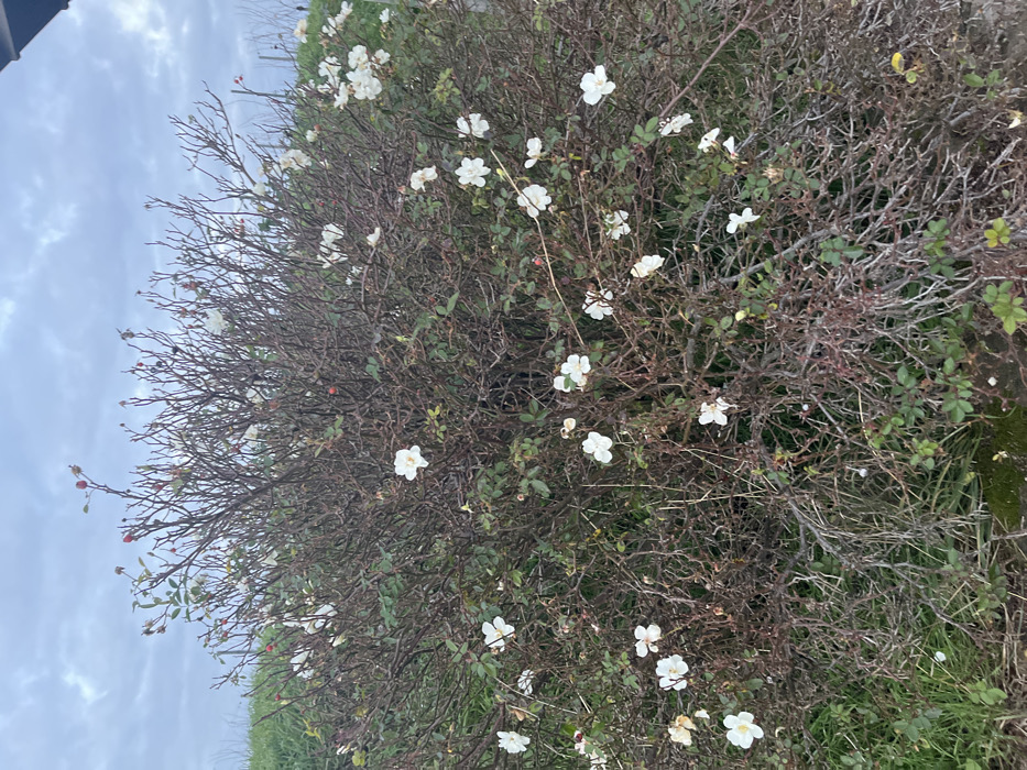 The image displays an outdoor scene in Obernai, France, focusing on a dense, deciduous shrub approximately 1.5 meters in height and width. The shrub consists predominantly of dark brown, interlocked, thorny branches, many of which are bare. Distributed across these branches are numerous five-petaled white flowers, totaling approximately 30 to 40 individual blooms, exhibiting various stages of opening. Sparse green foliage is visible among the branches, particularly in the lower half of the shrub. Several small, spherical red fruits, consistent with rose hips, are present on the upper branches. The ground directly beneath the shrub features sparse green grass and exposed soil. The background comprises a light grey, overcast sky occupying the upper portion of the frame, with a green grassy embankment visible to the left and slightly behind the shrub. No individuals or discernible man-made objects are present in the immediate foreground or midground.