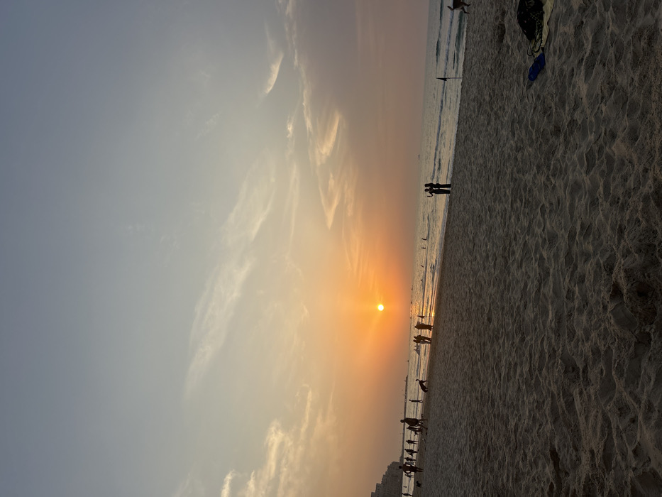 This image captures a sunset over a sandy beach in Tel Aviv, Israel, during the late evening