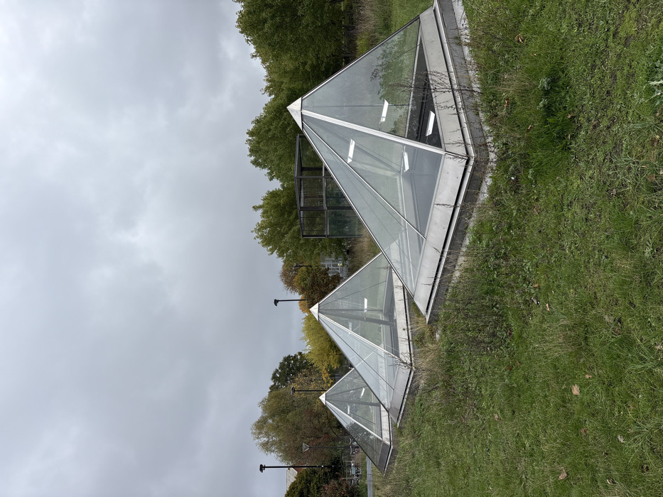 The image captures an outdoor scene on the South Campus (KUA) of the University of Copenhagen, Denmark. Three transparent glass pyramids, each with a silver-colored metal frame and a wide, grey plinth base, are positioned diagonally across a grassy field. The pyramid closest to the viewer, on the right, visibly contains internal horizontal fluorescent tube lighting fixtures. The ground cover consists of green grass mixed with patches of dry, wild vegetation, particularly around the bases of the pyramids. In the background, a dense line of deciduous trees displays both green and autumnal yellow and orange foliage. Several black lampposts are scattered among the trees and in the mid-ground. To the far left, a paved area with parked bicycles and a building facade is visible. Behind the central and right pyramids, a large, dark, open-frame rectangular metal structure stands. The sky is uniformly overcast with a grey cloud cover. No individuals are present in the scene.