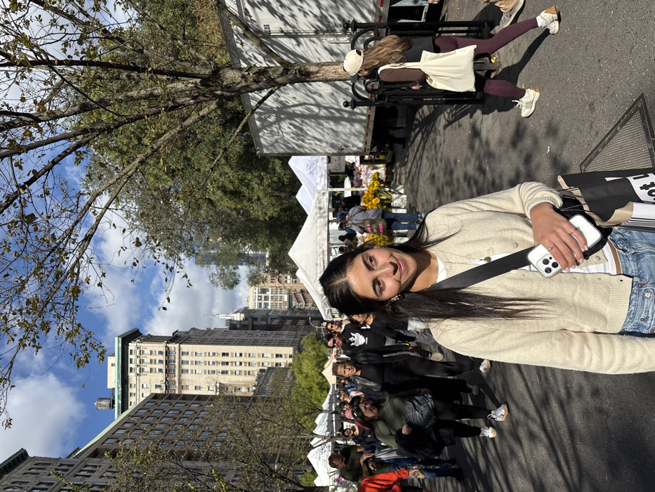 The image displays an outdoor market scene at Union Square Park in Manhattan, New York City, under a partly cloudy sky. A young woman with long dark hair, wearing a beige cardigan over a white top, light-wash jeans, and a black cross-body strap, stands in the foreground, holding a white-cased smartphone and a black shopping bag. She smiles subtly, looking towards the viewer's right. Behind her, a diverse group of people walks among numerous white market tents, some displaying yellow flowers. In the background to the left, tall urban buildings with characteristic architecture, including one with a prominent water tower and another with a spire, define the cityscape. To the right, a large white truck or trailer is parked, partially obscured by a tree with sparse leaves, which casts shadows onto the truck's side. Another individual, seen from behind, walks rightward, wearing a beige baseball cap, dark top, maroon pants, and white sneakers, carrying a beige tote bag.