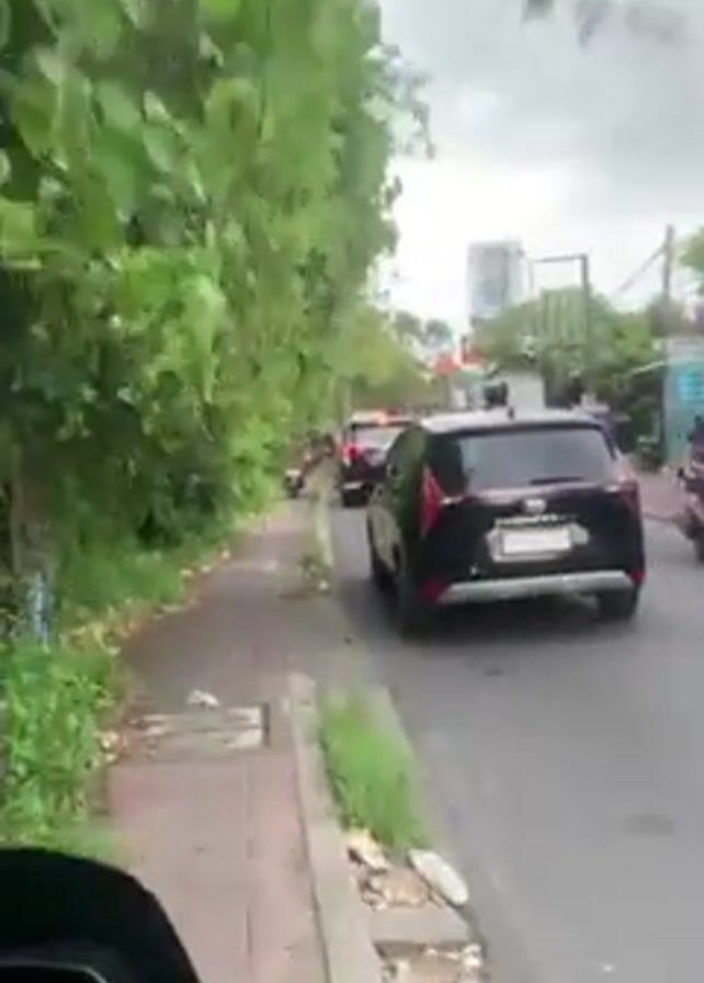 person riding a motorcycle on a road with heavy traffic. The view is from the rider's perspective, looking over the motorcycle's handlebars. The road is lined with lush green trees and foliage. In the background, cars and motorcycles are visible in the traffic. The camera angle moves up as the rider passes under low-hanging branches and power lines.