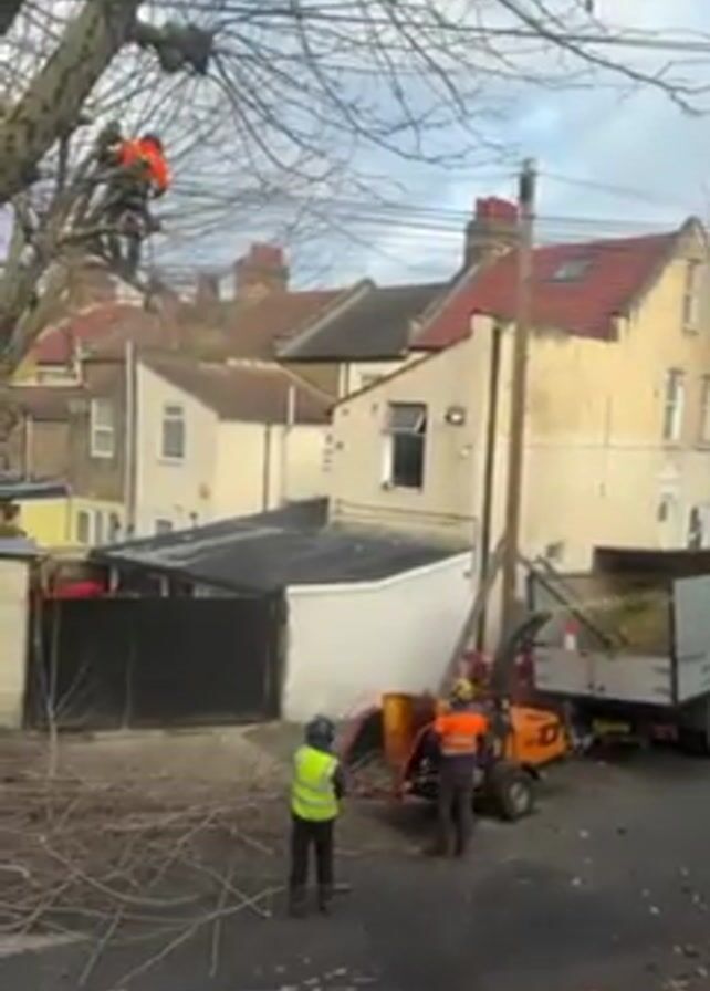 three men working on a tree-trimming project in a residential neighborhood. One man is high up in the branches of a large, bare tree, wearing an orange safety suit. On the ground, another man, also wearing orange, feeds branches into a wood chipper machine. A third man, wearing a yellow safety vest, stands nearby, seemingly observing the process. Branches that have been cut lie scattered on the street. Behind them, a truck is parked, presumably for hauling away the chipped wood. The backdrop consists of a row of houses under a cloudy sky. The operation is taking place on what appears to be a public street lined with residences.
