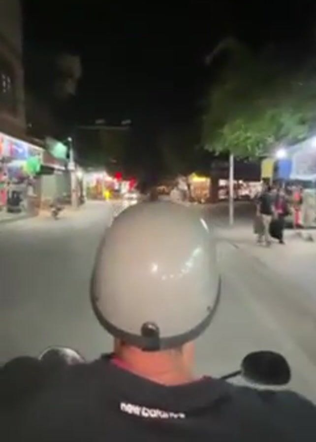 point-of-view shot from the back of a motorcycle, at night, riding on a brightly lit street. The motorcycle driver is wearing a grey helmet and a black "New Balance" shirt. The street is lined with buildings, shops, and people walking. The video is somewhat shaky.