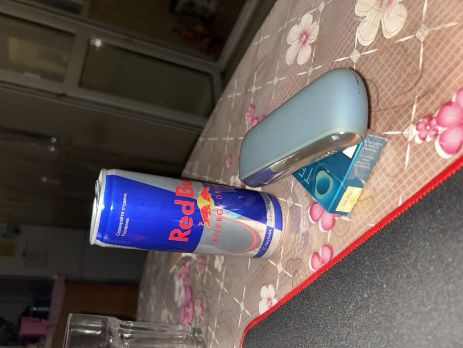 The image presents an interior still life scene captured in dim lighting, likely at night. On a table covered with a light-colored tablecloth featuring a repeating pattern of pink and white flowers and cross-hatched lines, several items are arranged. A prominent, open Red Bull energy drink can, silver and blue with the red logo, is positioned centrally; visible Bulgarian text on the can reads "Сервирайте студена. Газирана." (Serve cold. Carbonated.) and "С таурин." (With taurine.). To the right of the can rests a light blue IQOS device, possibly an ILUMA model, positioned atop a partially open, light blue box of TEREA tobacco sticks, which displays a gold Bulgarian excise stamp. To the left of the Red Bull can, a clear, ribbed glass tumbler is visible. The bottom-left corner of the frame shows a section of a black mousepad with a red border. The background is largely dark, with a large window or balcony door featuring white frames visible on the right side, reflecting some ambient light. Indistinct shapes of kitchen appliances, including what appears to be a refrigerator, are dimly discernible in the deeper background. The presence of Bulgarian language text on the Red Bull can and the excise stamp on the TEREA packaging confirms the scene is situated in Bulgaria. A specific location within the city of Varna cannot be determined from the visual evidence provided.
