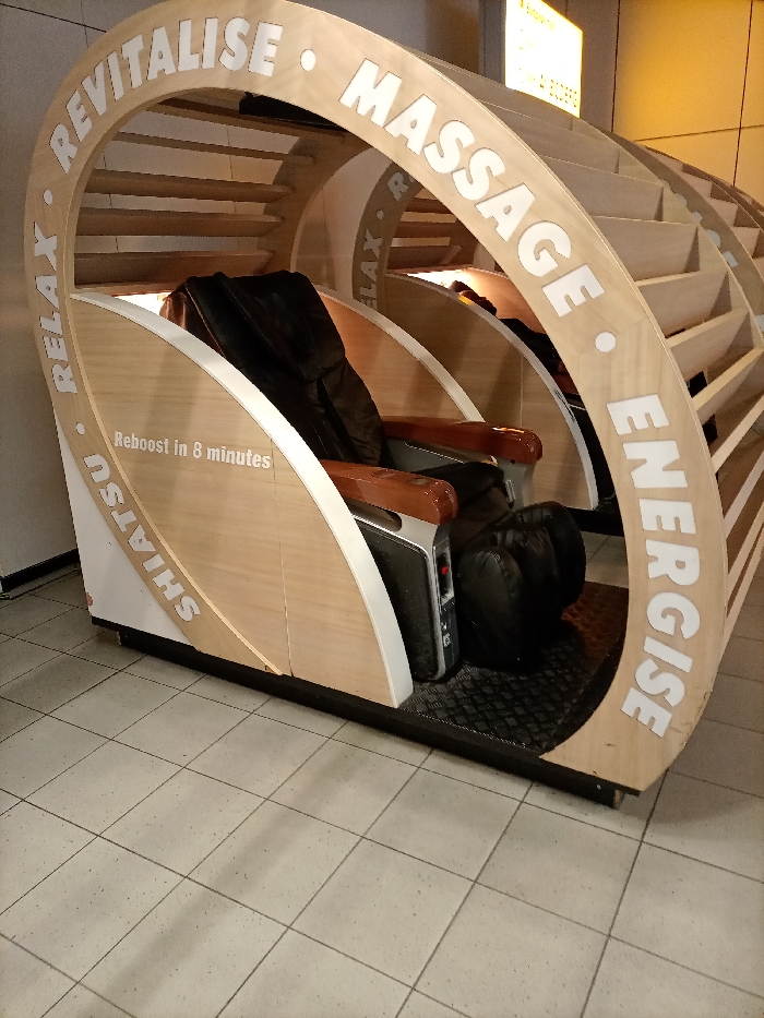 The image depicts a single, unoccupied massage chair unit situated within an indoor terminal environment at Schiphol, Netherlands