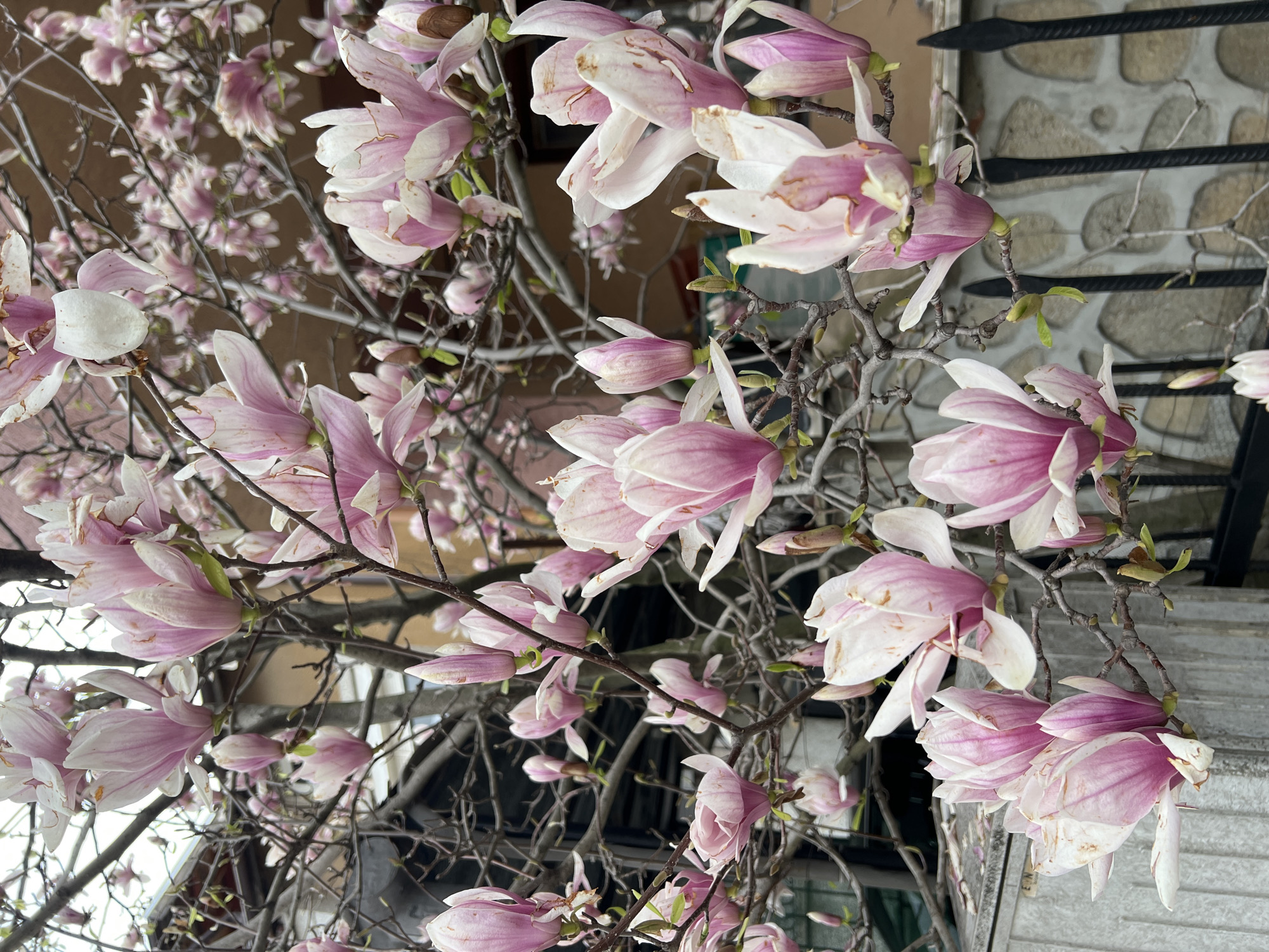 close-up view of a blooming magnolia tree with pink and white flowers. The tree branches are bare except for the blossoms. In the background, architectural elements are visible, including a stone wall and a wrought iron railing, suggesting an urban setting. The photograph appears to be taken at an angle, looking upwards into the tree. Without specific landmarks, identifying the precise location in Svilengrad, Bulgaria, is not possible.