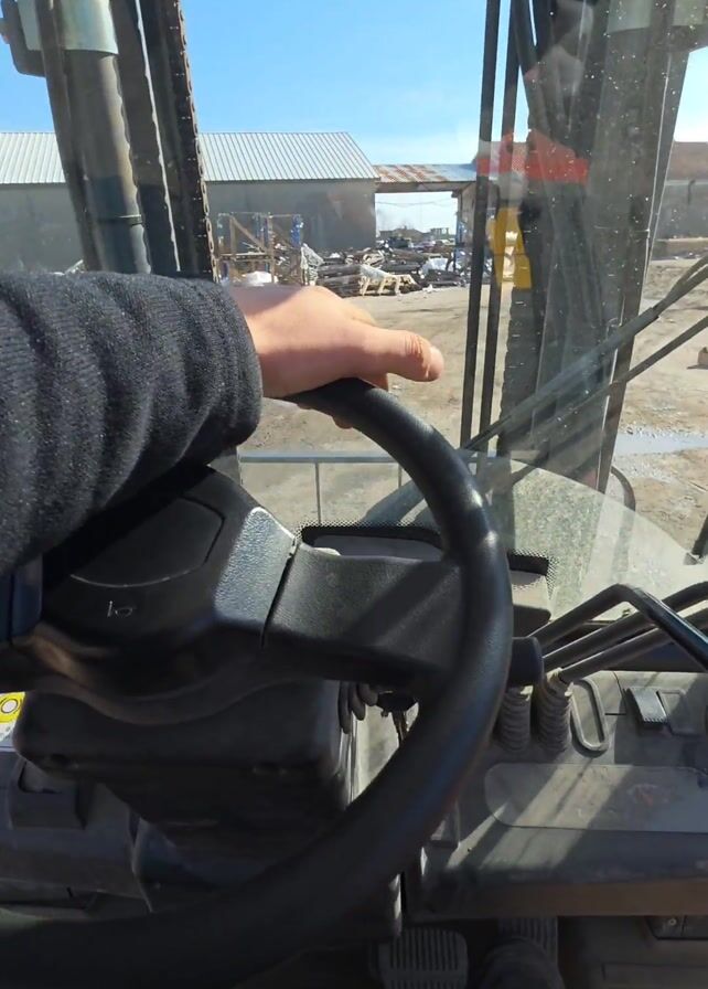 person operating a forklift, likely in a lumberyard or construction site. The camera is mounted inside the forklift cab, providing a first-person view. The operator's left hand is on the steering wheel. The forklift's controls, levers, and pedals are visible. Through the windshield, stacks of lumber and puddles on a dirt ground are visible. The sky is clear and blue, suggesting a sunny day. The forklift appears to be stationary. A large warehouse or building is visible in the background.