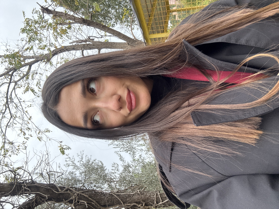 The scene, situated in Petrovac na Moru, Montenegro, depicts a young adult female in an outdoor portrait. She possesses long, straight, dark brown hair with lighter auburn highlights, parted centrally and extending over her shoulders. Her attire consists of a black turtleneck garment worn beneath a black collared jacket, with a magenta-colored fabric detail visible across her upper chest. The subject's face is oriented towards the camera, while her eyes are directed upwards and to her right, accompanied by a subtle, closed-mouth smile. Her lips exhibit a glossy appearance. The immediate background on the left side of the subject features a prominent, gnarled tree trunk entwined with vines, alongside the silvery-green foliage of olive trees. On the right side of the subject, a deciduous tree with thin, partially bare branches and sparse green leaves is visible. Further to the right, a yellow-painted metal structure, characterized by a grid pattern, is observed. The sky overhead is uniformly overcast and light grey. The environment appears to be an outdoor, vegetated area.