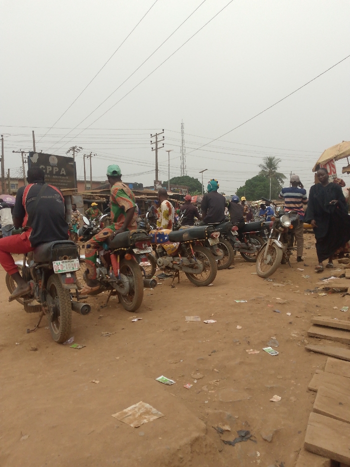 This image captures an outdoor scene at a commercial motorcycle (okada) park or waiting area in Lagos, Nigeria