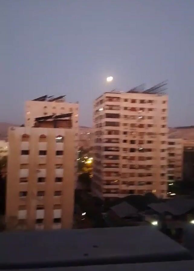 night cityscape with tall apartment buildings. A full moon is visible in the sky. The camera is shaky and appears to be handheld. Some lights are on in the buildings.