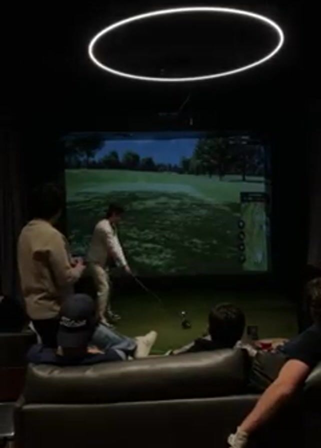 group of people in a dimly lit room with a golf simulator. A man in light-colored clothing is taking a golf swing in front of a large screen displaying a golf course. Other people are sitting on a dark-colored leather couch, watching him. One person on the couch is wearing a navy blue baseball cap with "Titleist" on it. Above, there's a large, circular, modern light fixture. The room has a relaxed, lounge-like atmosphere.
