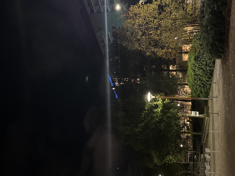 The image depicts an outdoor area of the Tilburg University campus in Tilburg, Netherlands, at night. A multi-story building, likely a university structure, occupies the upper right background, featuring the words "Tilburg University" illuminated in blue on its upper facade. Below and to the left of this building, a park-like space is illuminated by several streetlights with circular, downward-facing luminaires on tall poles. This area contains numerous trees, some with dense green foliage, and others displaying yellow autumnal leaves, along with extensive green shrubbery. To the far left, a stone sign partially visible at ground level also reads "Tilburg University." The foreground consists of a paved pedestrian pathway or plaza, edged by several white cylindrical bollards. Scattered fallen leaves are visible on the ground surface. The sky is dark with faint clouds. A prominent horizontal lens flare extends across the image, intersecting the illuminated "Tilburg University" sign on the building. No individuals are present in the scene.