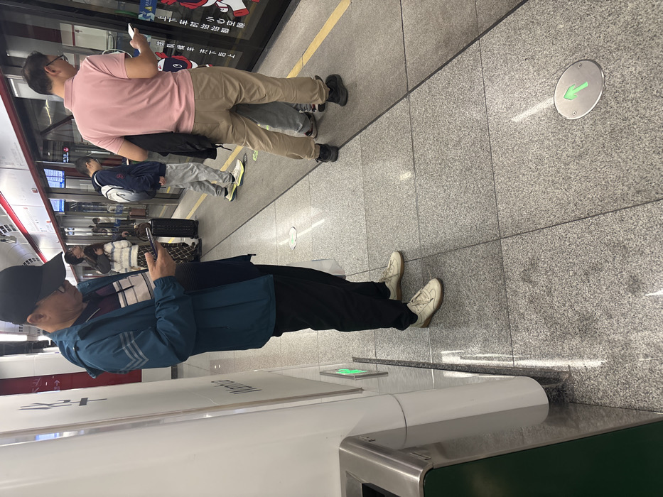 A subway platform scene shows several people waiting. One man in a pink shirt and khaki pants is looking at his phone. Another person, wearing a blue jacket and a black baseball cap, is also looking at a phone. A green arrow points the direction of travel on the platform floor. The subway car door is partially visible.