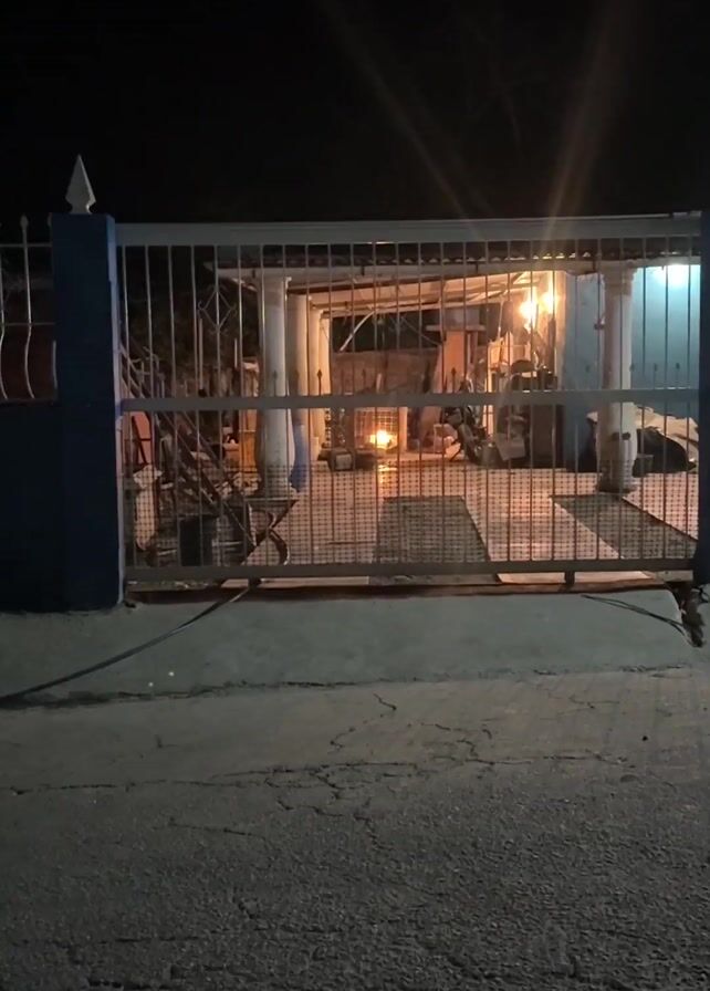 The video, shot at night, shows a metal gate obstructing the view of a house. Through the gate, an interior space is visible, lit by a warm light source, likely a fire. A couple of columns support the roof of what seems to be an open garage or patio. In the background, some indistinct objects are visible, including what looks like a motorcycle. The gate is closed, and the street in front of it is cracked. A dog can be heard barking in the background.