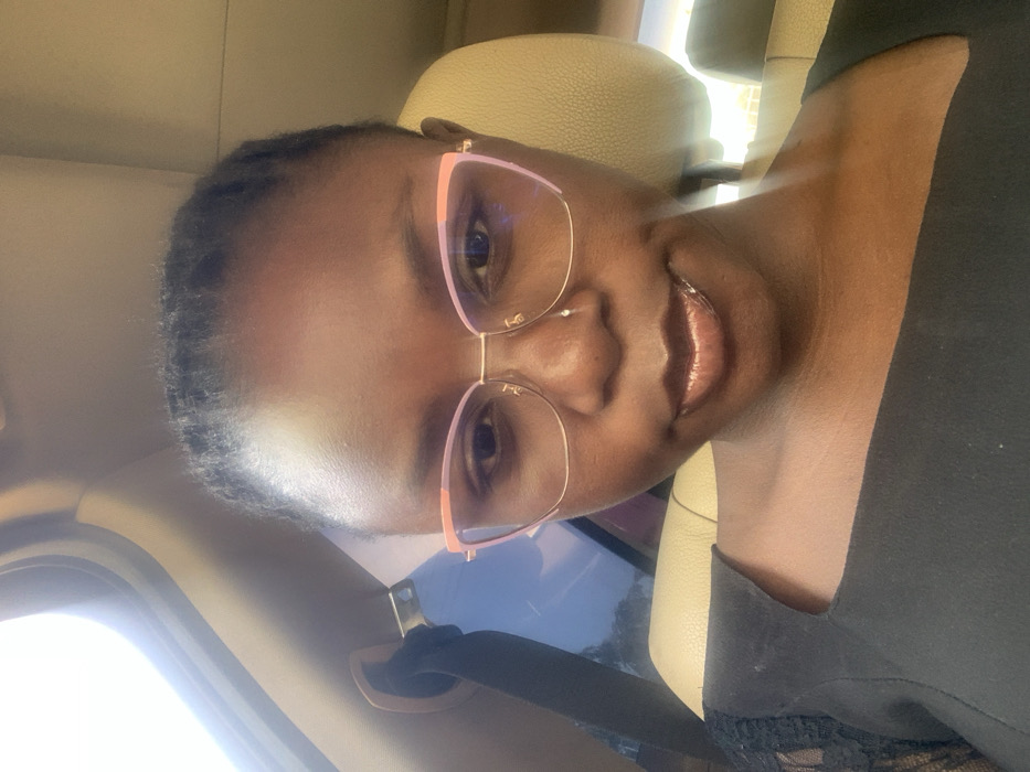 A close-up portrait depicts an adult female with dark skin, positioned within the interior of a vehicle