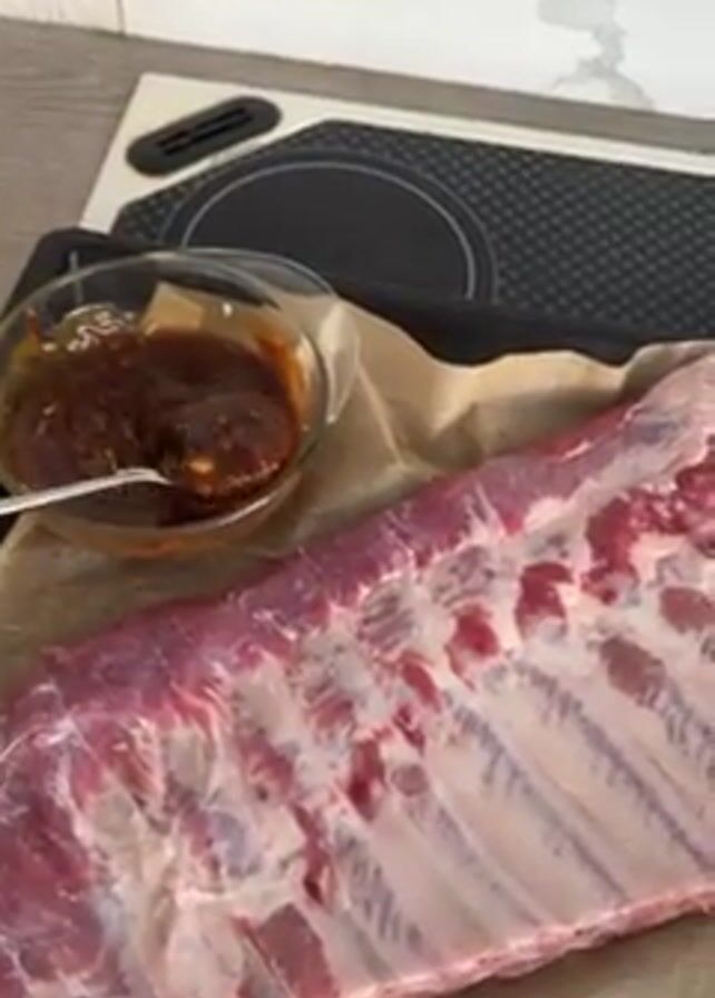 slab of raw ribs laid on a sheet of parchment paper that is on a black baking sheet, with a small bowl of dark brown sauce next to the ribs. A spoon is shown taking some of the sauce and putting it on top of the ribs. The sauce is a thick, somewhat lumpy, dark brown color. The ribs are pink with some white fat marbled in. The parchment paper is tan. The baking sheet is black with a raised rim around the edge. The countertop is a light brown wood grain. The background includes a small section of wall that is white with gray veining like marble and a black ceramic cooktop.