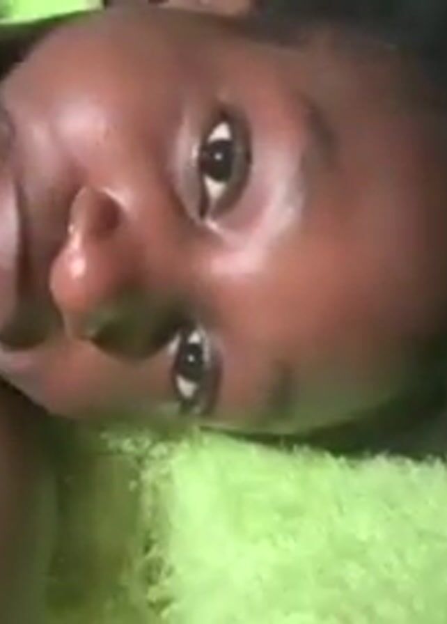 young Black woman lying on a green cushion. Her head is slightly tilted towards the camera. Her hair is partially braided. Someone's hand, presumably applying a product, is visible near her forehead. She smiles and appears to be looking directly at the camera. The lighting in the scene is dim.
