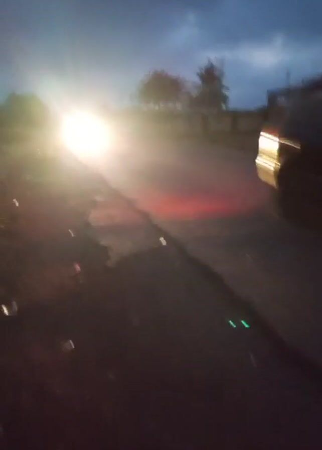 dark, overcast, and blurry scene of a street at dusk or night. A car with bright headlights approaches and drives past the camera. The headlights illuminate the road, and the taillights are visible as the car moves away. The road appears to be cracked and uneven. Trees and buildings are visible in the background. There are no people visible in the video. The video is shaky.