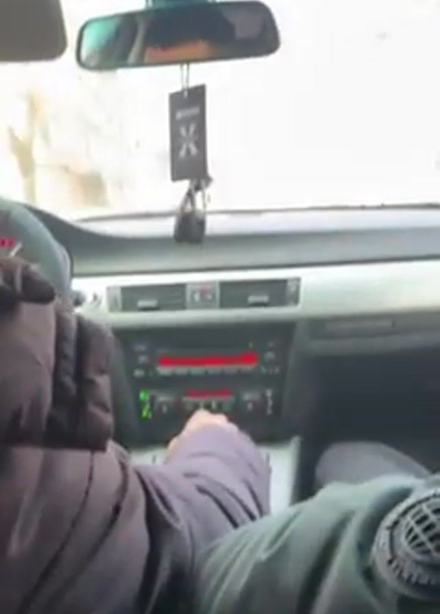 interior of a car, specifically the dashboard and front seats, as the car drives through a town on a sunny day. The driver, wearing a dark puffy jacket, is visible in the left seat. The dashboard features an older-style car radio. An "Areon X" air freshener hangs from the rearview mirror. Outside, buildings line the street, and other cars can be seen. The camera pans slightly to show more of the driver and the road ahead.