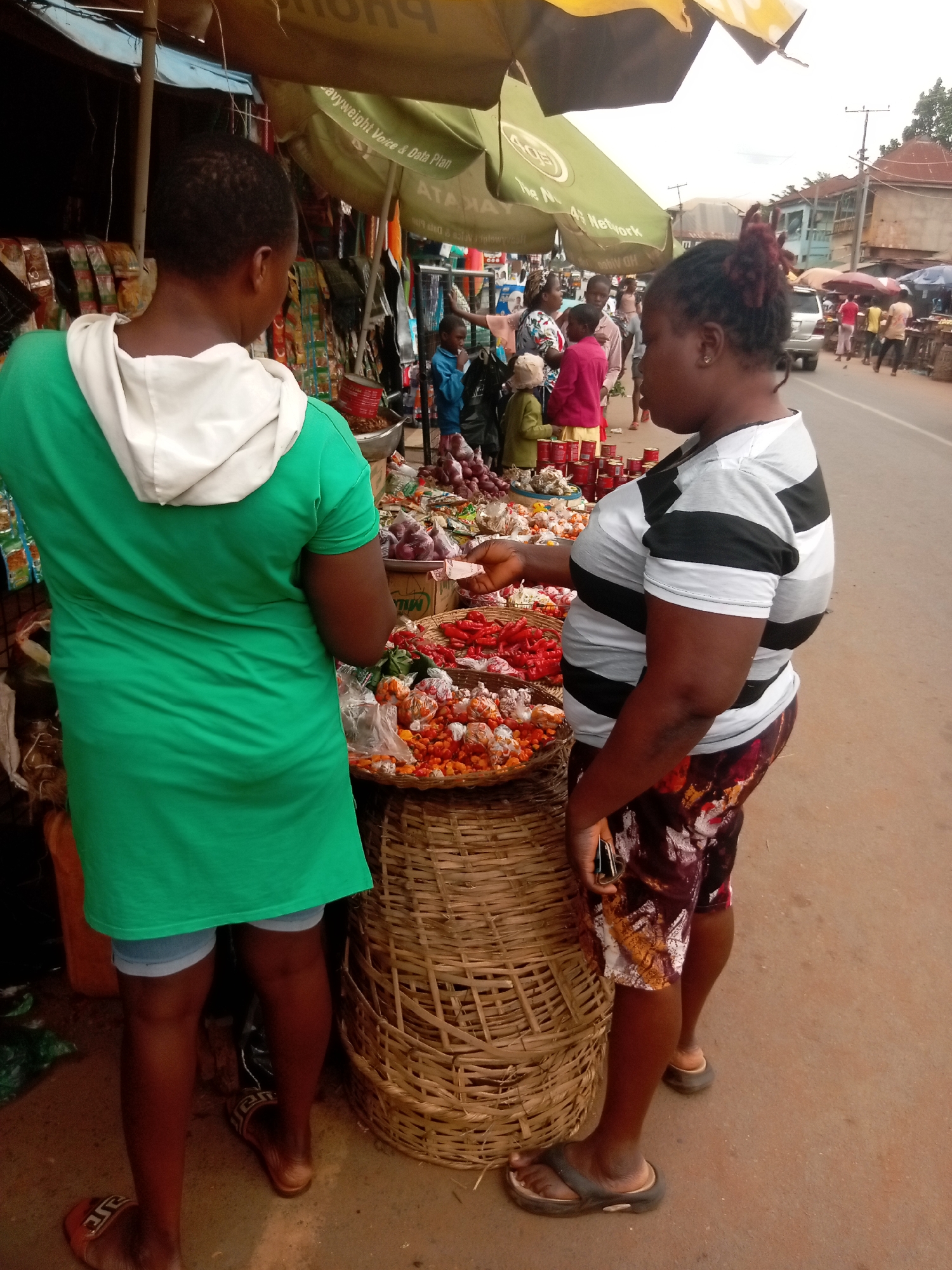 The image depicts an outdoor market scene in Nkpor, Nigeria. Two women are the central focus. One woman is wearing a green hooded dress and sandals. The other woman, who is examining the produce, wears a black and white striped shirt and floral shorts, along with sandals. Both are standing beside a woven basket filled with what appear to be peppers. Other vegetables and canned goods are visible on the table. In the background, numerous people are milling around, suggesting a busy market atmosphere. A street with a car and some buildings runs parallel to the market stalls. An umbrella provides shade to the market area.