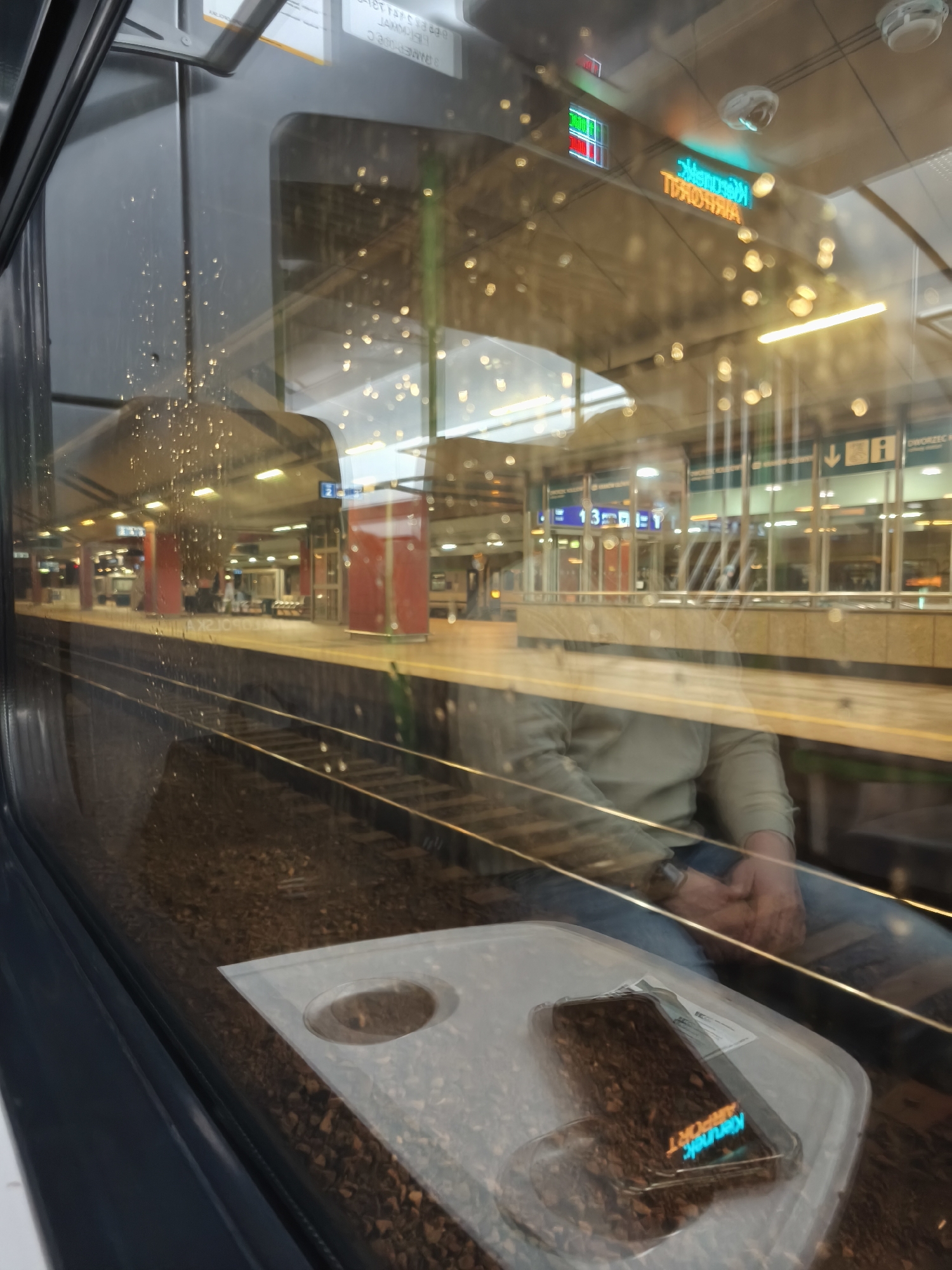 The image, taken from inside a train, shows a view of a train platform in Krakow, Poland