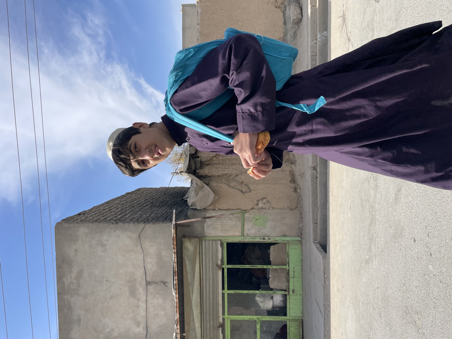 A young man stands on a sidewalk, wearing a traditional purple robe and a small white hat. He has a blue backpack slung over his shoulder and holds something small and yellow in his hands. Behind him is a weathered building with a closed, green-framed shop window. A concrete building with a simple roofline is visible to the left, under a blue sky with scattered clouds. Power lines stretch across the upper left corner of the frame.