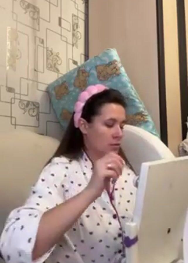 A woman with long brown hair pulled back with a pink headband is shown at shoulder-length in a bedroom. She is sitting on a white couch, wearing a white pajama top with a pattern of small red hearts. The background includes a beige patterned wallpaper, a light-colored cabinet, and a blue patterned pillow. The woman is looking into a small white framed mirror that she is holding in her left hand. In her right hand she is holding a small cosmetic sponge. She gasps, looks closely at the sponge, and then appears to be applying makeup using the sponge.