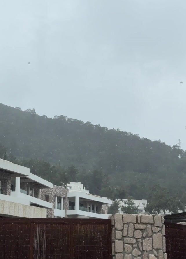 rainy day landscape. A hill covered in trees is visible in the background. In the foreground, there is a modern building with white walls and a rusted metal and stone fence. It's raining heavily, with visible raindrops falling throughout the scene. The sky is overcast and grey. A tree is visible on the right side of the frame.