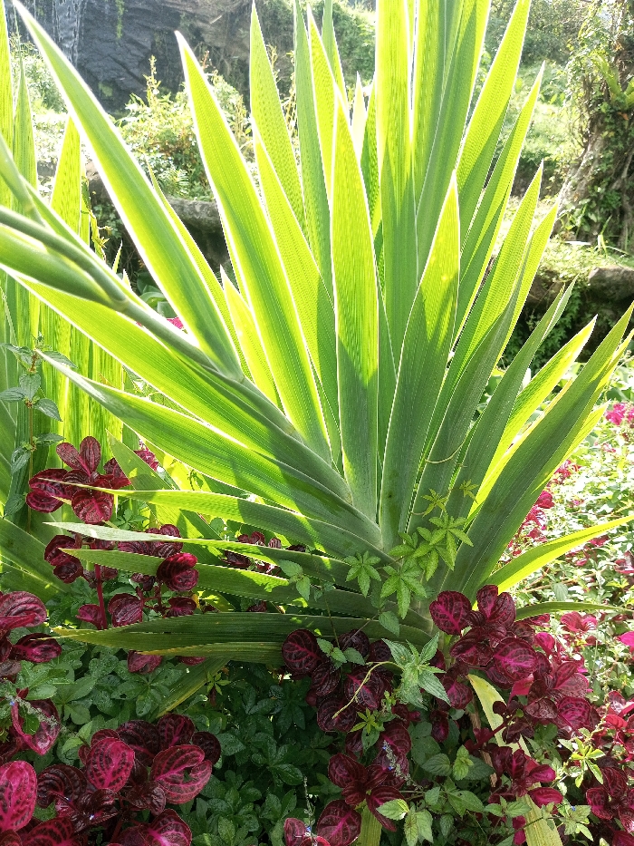 A cluster of sword-shaped, vibrant green leaves dominates the frame, catching the sunlight along their edges. At the base, maroon and green foliage creates a textural contrast. Small green plants with star-shaped leaves intermingle with the larger plant. The background shows glimpses of additional greenery and a rock wall, suggesting a lush garden setting.