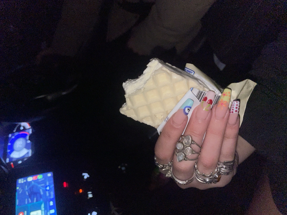 The image captures the interior of a vehicle at night. In the foreground, a left hand holds a partially consumed white ice cream bar. The bar has a waffle-patterned surface, a creamy white interior, and a bite taken from its upper right corner, remaining partly in its white and blue packaging. The hand is adorned with multiple silver-toned rings on the index, middle, ring, and pinky fingers. The index finger features a large ring with five clear or translucent stones. The fingernails are long and manicured, displaying distinct designs: an "evil eye" on the index finger, red cherries on the middle finger, yellow flowers on the ring finger, and red polka dots on a white base on the pinky finger. In the background, the vehicle's dashboard is partially visible with illuminated screens. A left screen displays a map or navigation interface, while a right screen shows the number "78," indicative of a speedometer. A light-colored limb is visible in the upper right background. The specific location within Ndlambe Local Municipality, South Africa, cannot be determined from the provided visual information.
