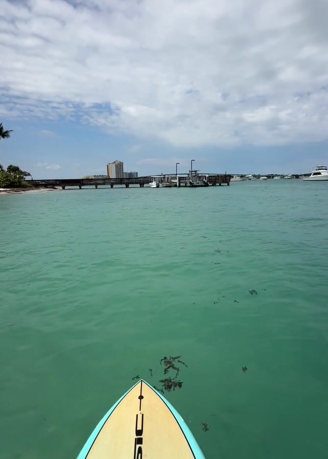 The camera is situated on a stand-up paddleboard, gliding towards a scenic beach under a partly cloudy sky. The water is a clear, turquoise hue, revealing scattered seaweed below the surface. In the distance, a pier stretches out, with a solitary building rising behind it. The beach to the left is lined with palm trees. The board itself features a yellow and tan deck with the bold black letters "SIC" prominently displayed.