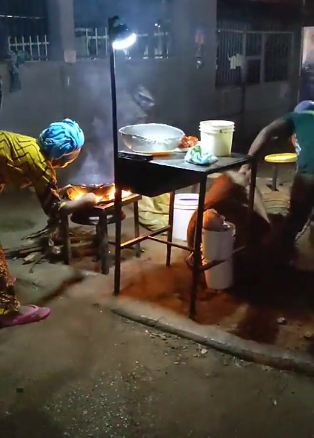 nighttime street scene where several individuals are engaged in cooking activities. A woman wearing a yellow and brown patterned dress with a blue headwrap is bent over a small, open fire. She is tending to the food cooking in a pan. A makeshift kitchen setup consisting of a small table with various containers, including a bucket and a bowl of tomatoes, is situated next to the cooking area. An overhead light illuminates the cooking space, casting shadows on the ground. Another person is partially visible on the right side of the frame, and another figure can be seen in the background. A building with a sign that says "MAA PARKING" is visible in the background. The ground appears to be pavement. Smoke is rising from the open fire.