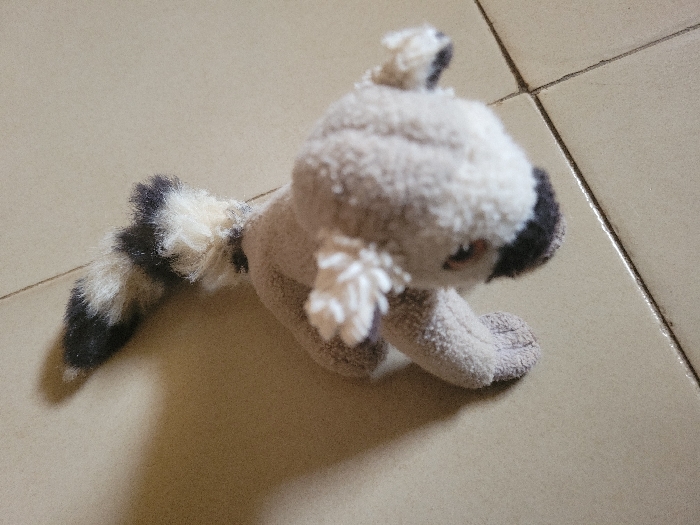 A plush toy resembling a ring-tailed lemur rests on a light-colored tiled floor