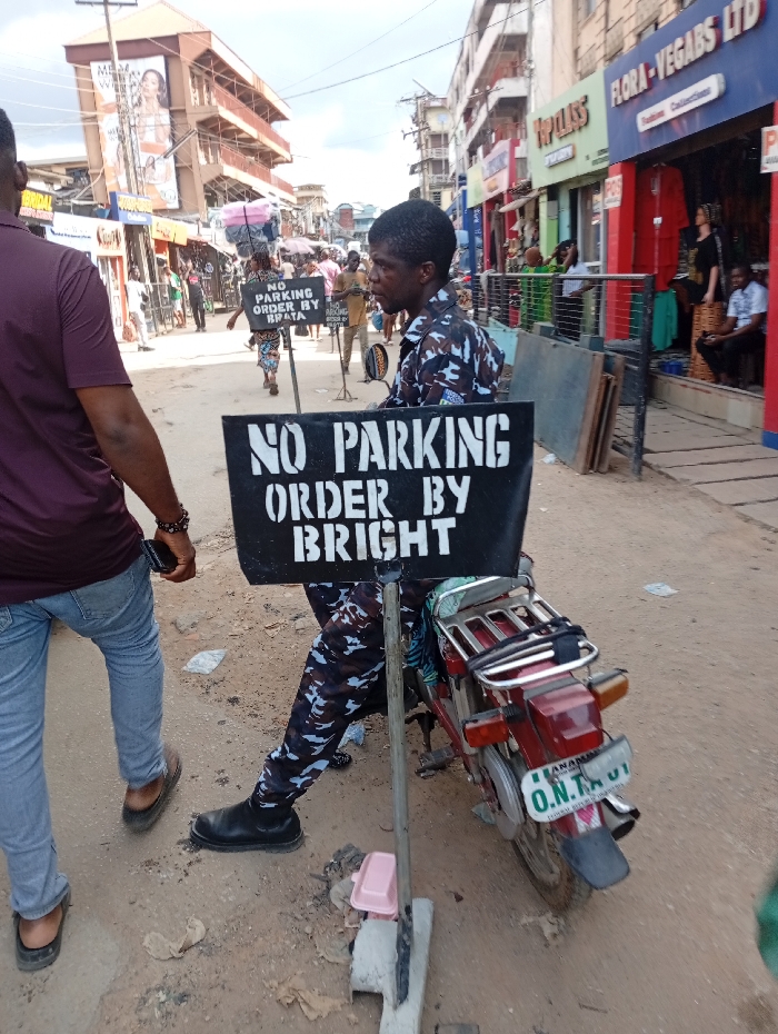 The image depicts a bustling street scene in Nkwelle, Nigeria, characterized by commercial activity and pedestrian movement. In the foreground, a male figure is observed from behind, wearing a dark purple t-shirt, light blue jeans, and brown slip-on shoes, holding a dark smartphone in his right hand. To his right, another male figure, with dark skin and short dark hair, wears a blue and black camouflage-patterned uniform consisting of a long-sleeved shirt and trousers, paired with black boots. He stands leaning slightly, looking to his left. A prominent black rectangular sign with white stenciled text, "NO PARKING ORDER BY BRIGHT," stands upright, supported by a metal pole anchored by a concrete base, positioned between the two foreground figures and a red motorcycle. The motorcycle, equipped with a chrome rear rack, bears a Nigerian license plate from "ANAMBRA STATE" with the number "0.N.T.A.01." The ground beneath the figures and objects is an uneven, dusty mix of light brown earth and concrete, scattered with small pieces of debris, including plastic fragments. In the midground, several pedestrians move along the street, and another individual further down is seen carrying a similar "NO PARKING ORDER BY OBATA" sign. The background features multi-story commercial buildings lining both sides of the street, displaying various business signs such as "FLORA-VEGABS LTD," "TOP CLASS," and a large banner advertising "MEN WEAR WEDDING." Utility poles and overhead wires are visible, extending into a bright, overcast sky. The overall scene suggests a busy urban commercial district.