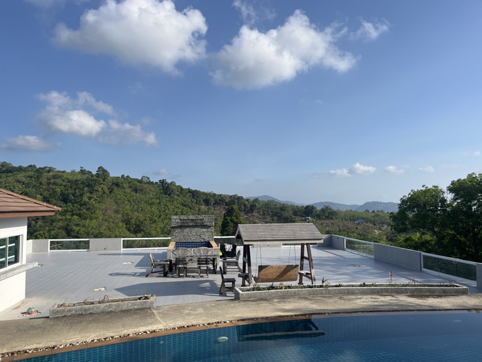 The image displays an outdoor recreational area and landscape view situated in Kamala, Thailand. In the immediate foreground, the edge of a blue-tiled swimming pool with a pebbled concrete border is visible. Above the pool, a spacious, light-grey tiled rooftop terrace occupies the midground. On the terrace's left side, a section of a white building with a brown tiled roof and a window is present. Centrally positioned on the terrace is an outdoor dining arrangement consisting of a table and chairs, situated in front of a stone-clad structure. To the right, a wooden swing set with a sloped roof is observed. A low concrete planter box extends along the terrace edge near the pool. The terrace is delineated by a glass and concrete railing. The background features extensive, verdant, densely forested hills and mountains under a clear blue sky with dispersed white cumulus clouds, indicating a tropical environment. No individuals are present in the scene, and no specific actions or interactions are occurring.