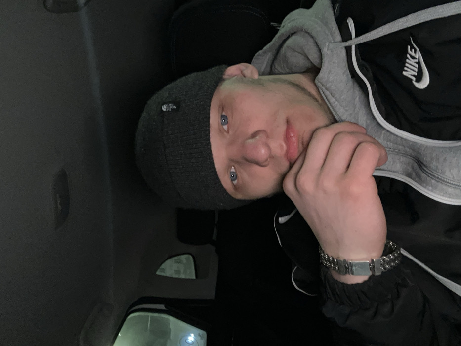 The image displays a male subject, appearing young adult, captured in a close-up, frontal portrait within a vehicle interior. The subject possesses blue eyes and maintains a neutral expression, with his left hand resting beneath his chin. He wears a dark grey ribbed knit beanie with a discernible rectangular brand tag on the front, a grey hooded sweatshirt, and a black athletic jacket featuring a white Nike logo on the right chest. A silver-toned metal link bracelet is present on the subject's left wrist. The vehicle's cabin is characterized by low light conditions and dark upholstery. Exterior elements are visible through the rear-left window, consisting of blurred artificial lights and faint architectural outlines, indicative of a nighttime setting. The precise geographical location within Dobryanka, Russia, is not ascertainable from the visual evidence.