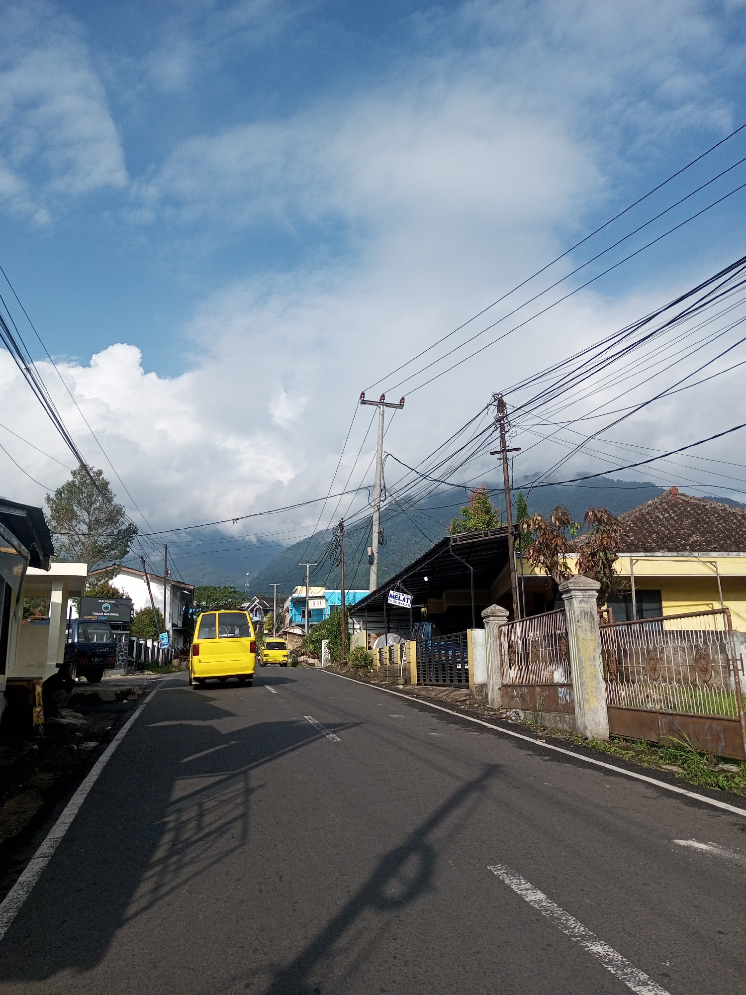 street in a residential area. Two yellow vans are driving on the asphalt road. Buildings line both sides of the street, with power lines overhead. Mountains are visible in the background, partially obscured by clouds.