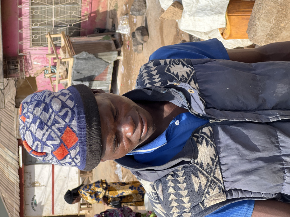 The image portrays an outdoor urban environment in Gwong, Nigeria, under direct sunlight. In the immediate foreground, a dark-skinned adult male is depicted from the chest up, with his head tilted downwards and eyes appearing closed or cast towards the ground. He wears a blue polo shirt, an unzipped dark blue sleeveless puffer vest with an additional knit layer featuring a geometric grey and beige pattern across the shoulders, and a knit beanie patterned in blue, grey, and orange with distinct orange diamond shapes. The background reveals a dusty, light brown ground with several irregular rocks or pieces of concrete scattered. To the left, a light-colored building with a corrugated metal roof is partially visible, featuring a sign that reads "BARBER SHOP." Behind the foreground subject, a female figure in a yellow and black patterned dress and a dark head covering stands partially obscured. To the right, a vibrant pink building with a corrugated metal roof and a window secured by a metal grill is present. A wooden stand or shelf structure, holding what appear to be more rocks, is positioned near the pink building, alongside a dark tarp covering an unseen object. In the lower right background, a white tarp partially conceals a yellow container.