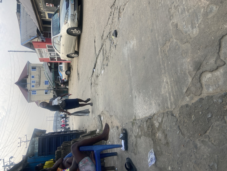 A slightly tilted street scene features a person walking with an umbrella in hand. Cars are parked on the side, and a building with multiple windows is visible. In the foreground, a person sits on a blue plastic chair with their legs outstretched. Black flip-flops and a plastic bag are scattered on the concrete ground. The street itself is cracked and worn.