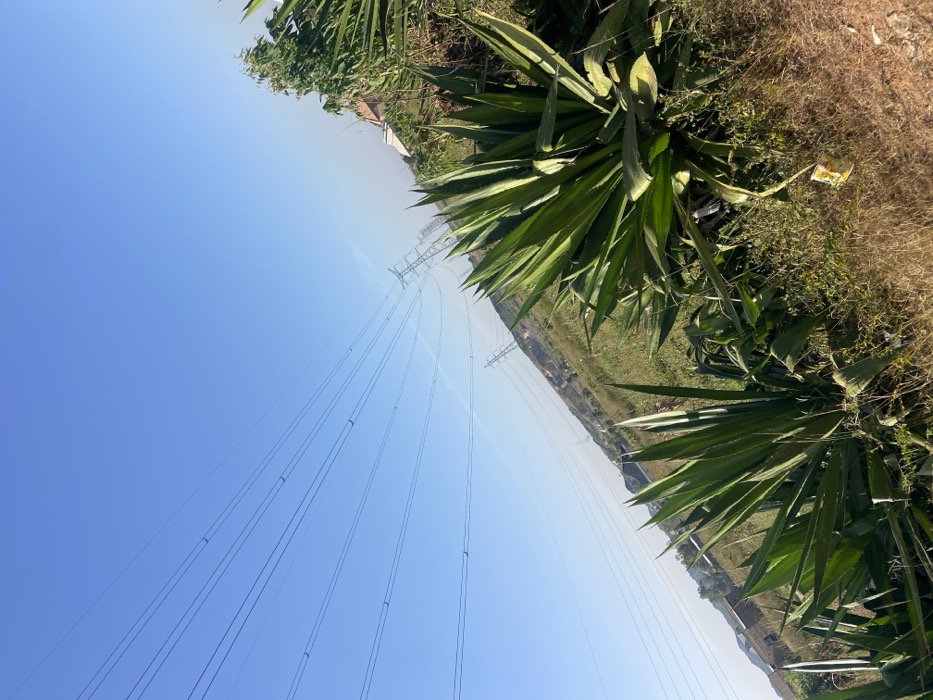 The image depicts an undeveloped or semi-developed area within or on the outskirts of Jos, Nigeria, characterized by power transmission infrastructure and natural vegetation under a clear sky. The perspective is tilted upwards and to the right. The upper two-thirds of the frame consist of a clear, bright blue sky. Multiple parallel overhead power lines, supported by at least four visible lattice steel transmission towers, traverse the sky from the lower-left to the upper-right, receding into the distance. The foreground and midground are occupied by clusters of large, green, succulent-like plants with thick, pointed leaves, likely agave or a similar species. The ground beneath these plants is covered with dry, brownish-green grass and sparse weeds. A single crumpled yellow and white plastic wrapper is visible on the dry ground in the lower-right corner. The terrain slopes gently upwards from the left to the right. In the distant background on the left, several light-colored buildings are discernible, suggesting proximity to a populated area. A reddish-brown roof structure is partially visible behind the foreground vegetation on the far right. No people, specific actions, or interactions are present in the scene.